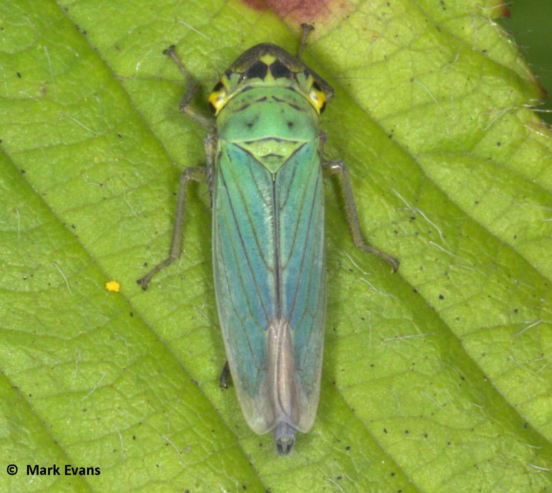 The Green Leafhopper is a common and distinctive insect, found in damp grassland during the summer. The females have bright turquoise coloured wings, while the males have darker blue wings which can appear black; both have yellow faces with black markings. They are large for leafhoppers, though at 6-8mm long they are still quite small!