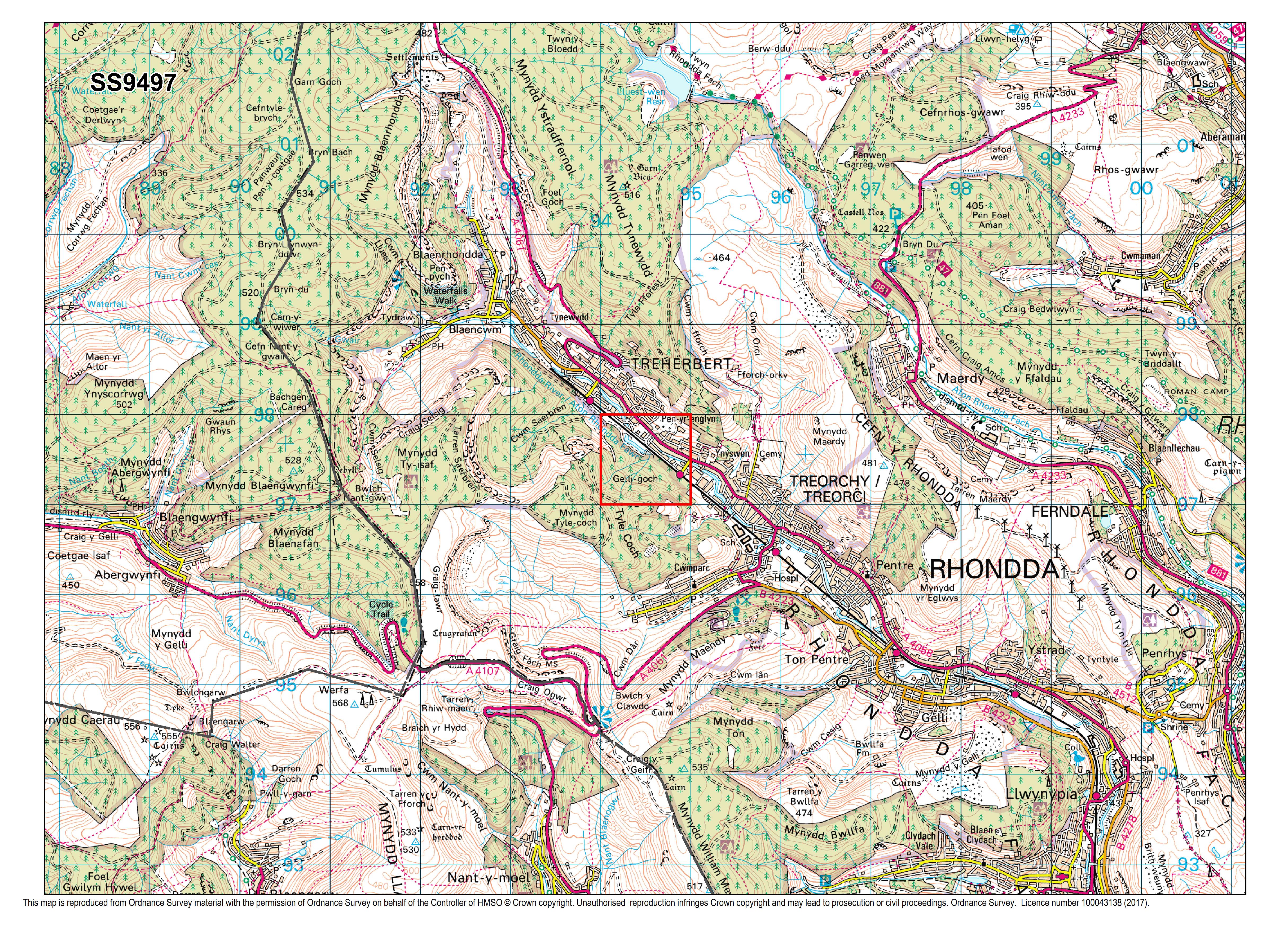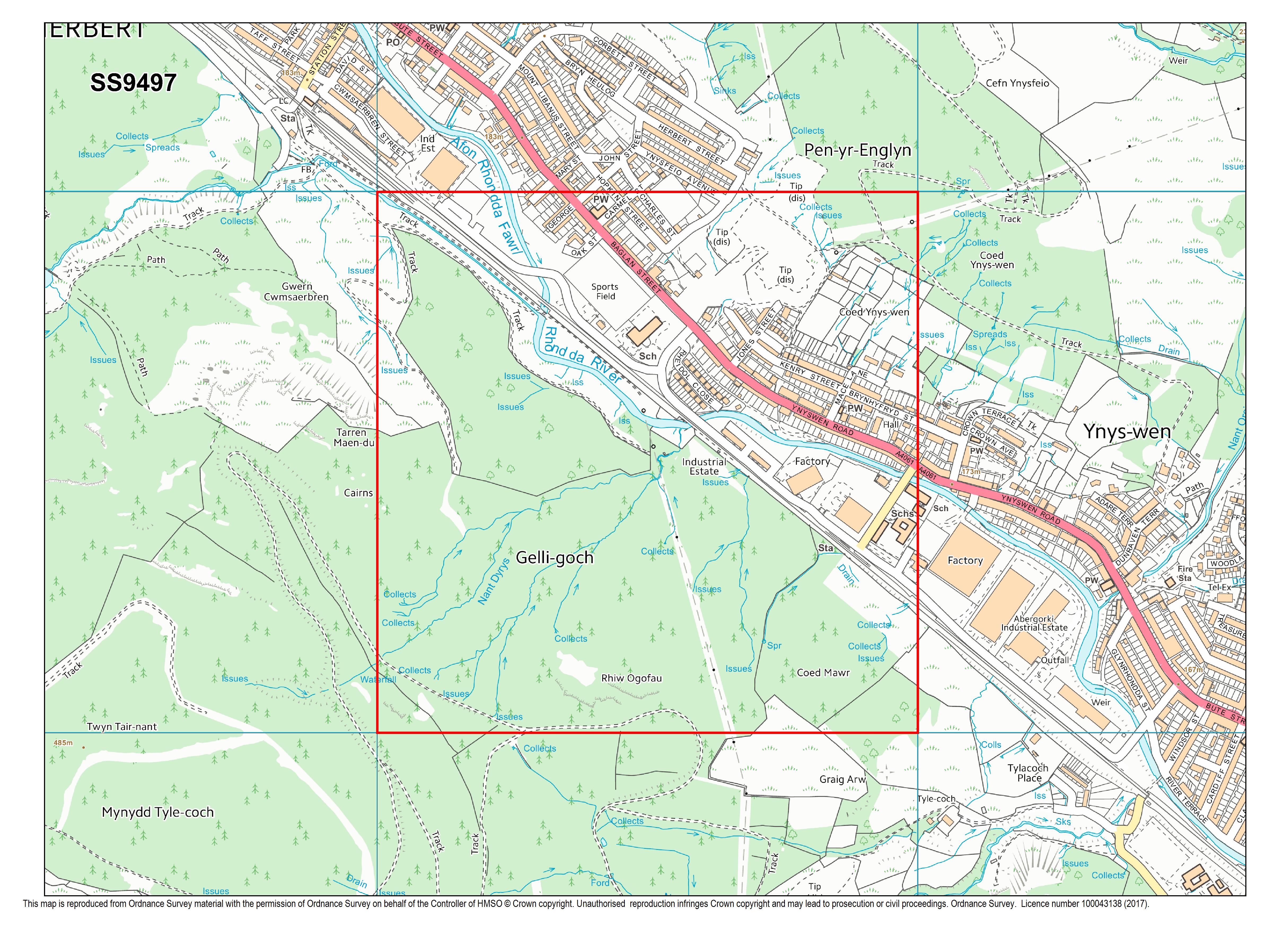 Located in the centre of Treherbert, this square contains a mixture of houses and woodland, with a main road and several streets running through it.