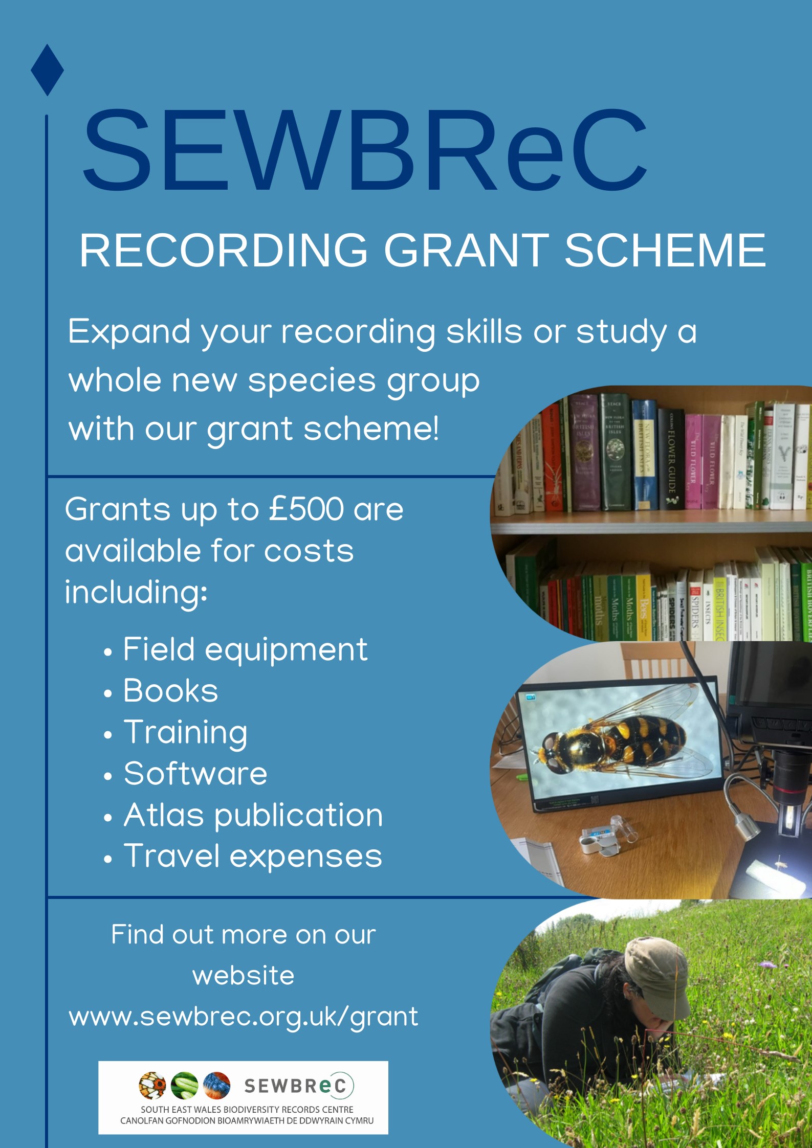 We also have a streamlined Books Grant Scheme of up to £75 for field guides, taxonomic keys and other relevant publications. Download a book application form and return to info@sewbrec.org.uk.