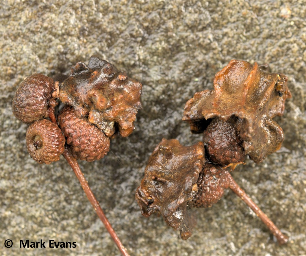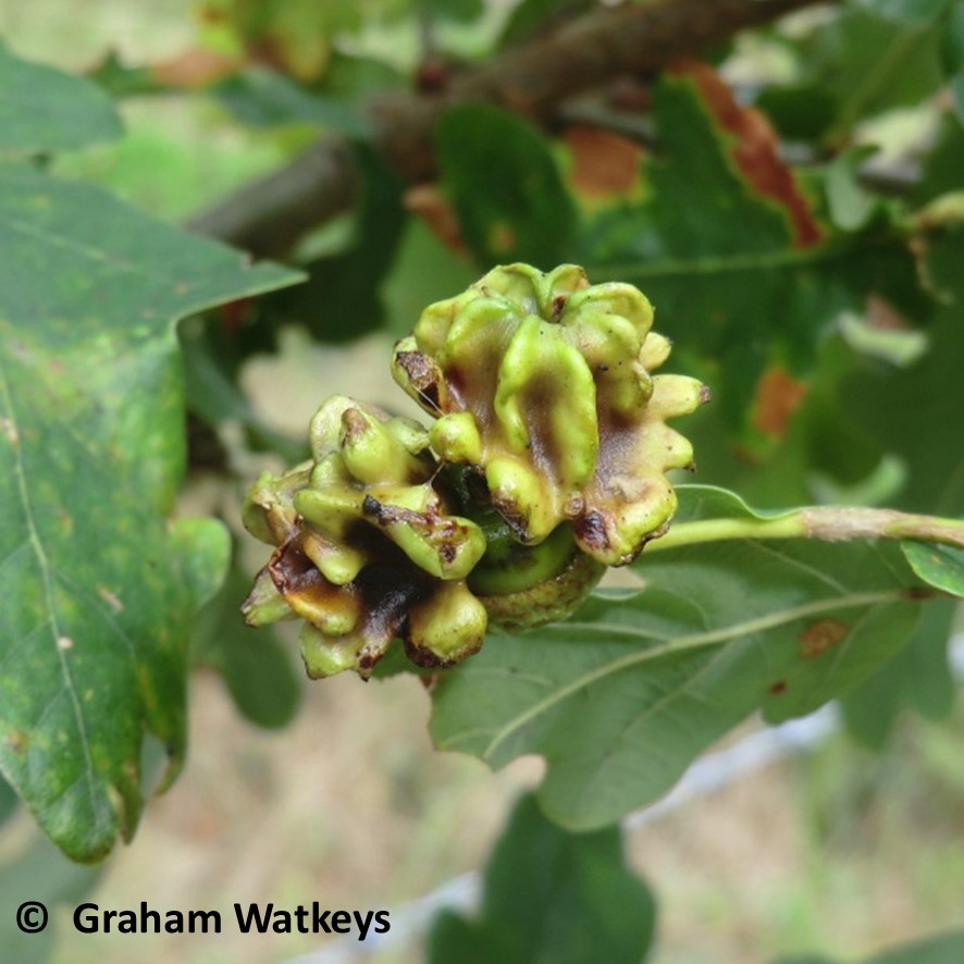 This species was first found in Britain during the 1960s, and is now widespread throughout the country. The wasp has a complicated life cycle, alternating between asexual and sexual generations which require Turkey Oak plus Penduculate or Sessile Oak to complete a cycle. The generation which form Knopper Galls are form agamic, so these galls should be recorded with the full name Andricus quercuscalicis f. agamic.