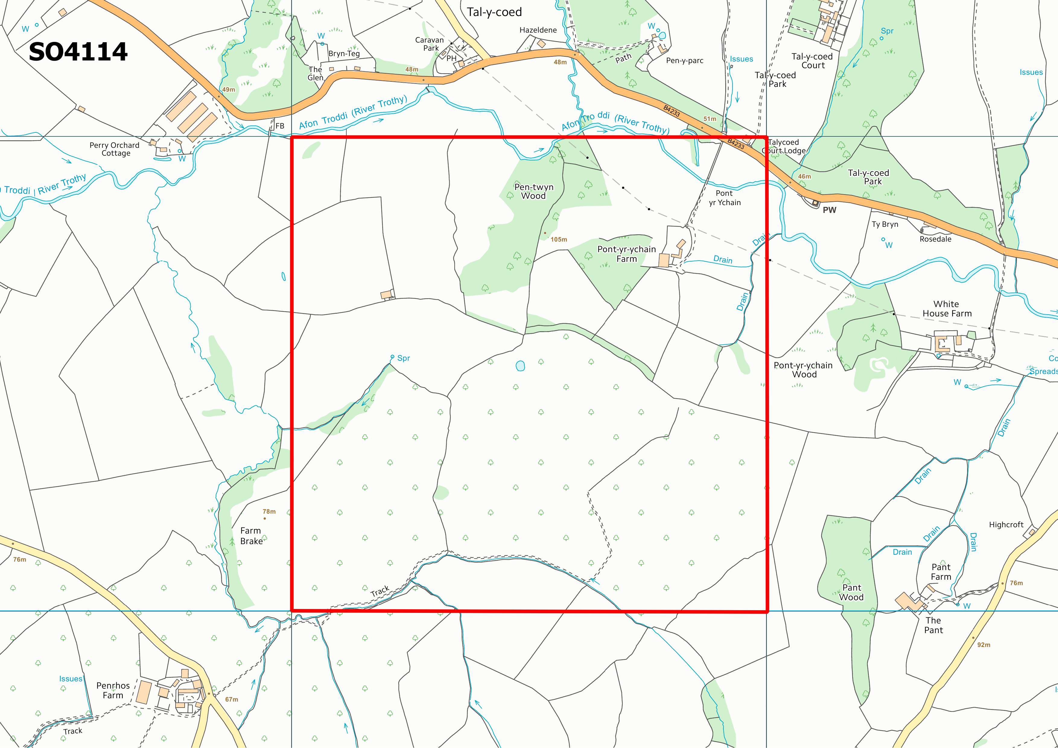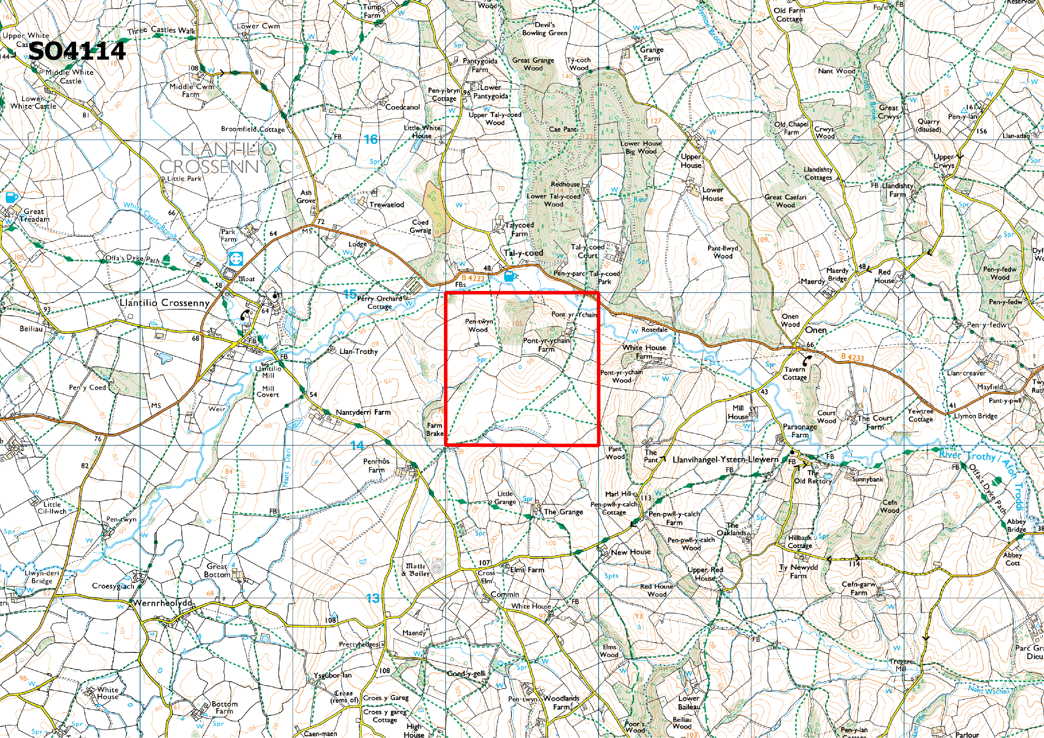 Located near Llantilio Crossenny in Monmouthshire, this square has been selected as it contains zero modern records. The last records for this square are from 2014 (11 years ago). There are 57 non-sensitive species previously recorded within the square, a list of these species can be viewed on Aderyn (link below). The square includes woodland and farmland. There are several rights of way running through it.